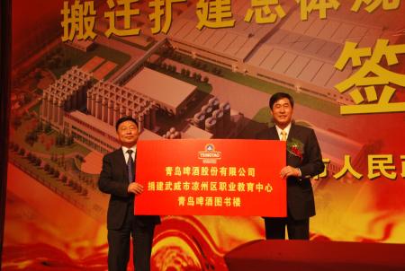 青岛啤酒公司副总裁黄克兴表示,青岛啤酒将积极支持武威市委市政府“工业强市”和“生态安全”战略,作为扎根甘肃、落户武威的企业公民,青岛啤酒始终坚信企业发展是责任付出与信任收获的互动过程,付出的是责任,收获的是信任。青岛啤酒一直积极履行企业公民责任,全面回报股东资本、社会资本、环境资本和人力资本。签约仪式上,青岛啤酒公司宣布捐建武威市凉州区职业教育中心—青岛啤酒图书楼。