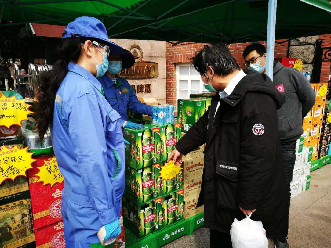 在麦岛家园,居民握着宣传单页,循着显眼的青啤道旗接踵而来。