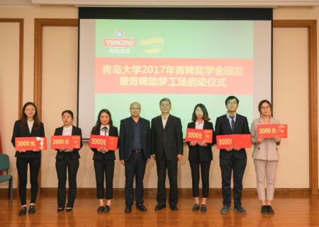 当天,青岛市教育发展基金会理事长何建平、青岛市教育局副局长王铨、青岛啤酒股份有限公司总裁助理兼人力资源管理总部部长汪岩等也参加了奖学金的发放仪式,并宣布在青岛大学设立青啤奖学金的基础上,实施青岛啤酒“助梦工场”系列活动。这代表着青岛啤酒的助学行动将不仅仅止于奖学金的资助,而要构建物质资助、道德浸润、能力拓展、精神激励等四大方面有效融合的长效机制。