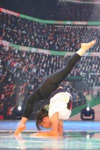 原来,一位身材矮小且光脚的胖女孩走到台前。与身材婀娜、精心着装的选手相比,其白色宽松T恤、黑色短裤的日常装扮,让人不禁质疑她的来意。却不料,当劲歌响起,肖美玲化身柔软的面条,侧翻身、连翻滚、180度劈叉,一连串高难度的动作瞬时引爆全场的激情。一向以毒舌著称的赵守镇,竟主动提出送鞋,并邀请她参加自己的婚礼。这让同为好友而未受邀的主持人谢楠大呼“吃醋”。