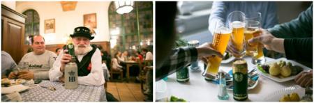 在拥簇的人群中,我们发现了一批身着巴伐利亚特色服装的老酒客,他们虽年过花甲,但啤酒赋予的激情使他们欢快地与身边人互动。这些资深酒客都是默认会员,每人都有印制自己名字和照片的马克杯,只有在这里喝酒超过30年以上,才有资格拥有!最后我们拿出了仅剩的两罐奥古特赠与酒客,老人品尝了一罐,赞不绝口,并表示另一罐要自己收藏。