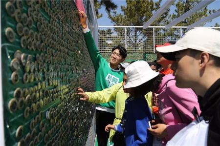 记者还没有靠近青啤欢聚吧的时候就已经看见欢聚吧的周围围满了已经完赛的参赛选手,走到近前才了解到,原来青岛啤酒为每一位马拉松跑者打造独一无二的专属青啤徽章,徽章上刻着参赛选手的名字最后一字,更刻下了2019青岛马拉松的时光与记忆。除此之外,现场扫码注册,根据提示成功领取专属马拉松徽章后,还可以获赠青岛啤酒马拉松定制留言罐——而无论是赛事的参与者还是普通观众,都将有机会把自己的马拉松记忆,用一个独一无二的定制青岛啤酒罐铭刻、定格。