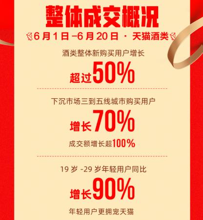 战报显示,酒类整体新购买用户增长超过50%,19-29岁的年轻用户同比增长90%,年轻用户更拥宠天猫。