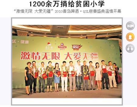 当天,2010青岛啤酒•QSL慈善盛典通过捐款、慈善拍卖等形式,共募集善款高达1294.8万元,据悉,这些善款将全部用于推动贫困地区青少年体育事业的蓬勃、持续发展,为贫困小学设置爱心体育园地设施使用。