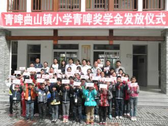 为老师和孩子送去一年一度的青啤奖助学金是项目组此行的重要任务,本着让更多的孩子得到鼓励,青啤公司要求校方从1-6年级严格筛选50名品学兼优的孩子进行100元奖学金的奖励。地震当中,青啤曲山镇小学的老师全部坚守在岗位上,保护了全校的孩子安全撤离,但失去亲人的痛苦和经济上的困境始终无法挥去和释怀,老师的心灵更需要得到抚慰和关爱,因此青啤奖助学金每年对10名优秀的教师进行每人1000元的奖励。连续两年获得奖助学金的阮老师表示,地震后她一直教育学生,经历灾难是痛苦的,但活着就要健康的走下去,感谢青啤奖学金让她找回了自信。地震以来,青啤公司每年拿出1.5万元在青啤曲山镇小学设立“青啤奖助学金”,在很大程度上辅助了心理项目的治疗,带动了师生的工作和学习积极性。该活动开展的这三年,青啤公司共计捐赠4.5万元,奖励了150名学生和30名教师。在青岛啤酒的影响下,青岛健力源公司、青岛市微尘基金也对心理援助的三所学校的学生进行了以资助学鼓励。