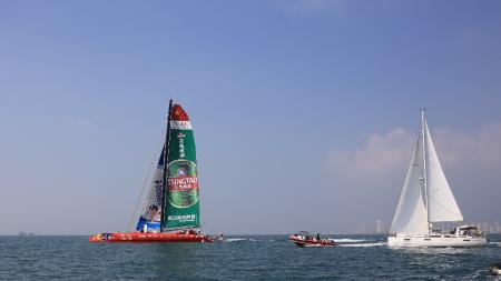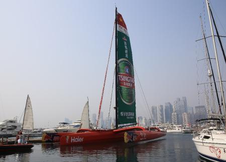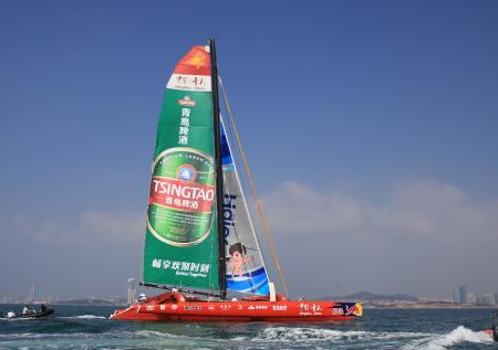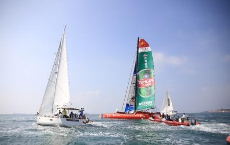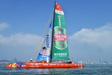 10月21日上午,由“中国职业帆船第一人”郭川、“中国女子环球航海第一人”宋坤领衔的“中国·青岛”号超级三体大帆船国际船队在青岛奥帆中心正式起航,开启21世纪海上丝绸之路的航行。青岛市副市长、21世纪海上丝绸之路“中国·青岛”号帆船航行组委会主任栾新,青岛奥帆城市发展促进会常务副会长臧爱民、青岛啤酒股份有限公司副总裁刘英弟等出席了起航仪式。