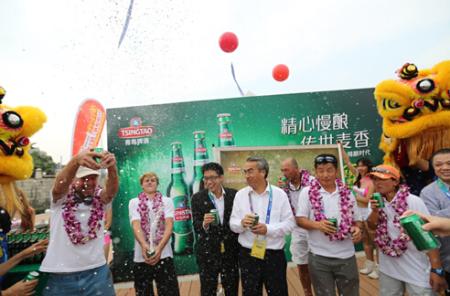 随后船员们与现场嘉宾,共同开启青岛啤酒来庆祝广州站的顺利到达,四溢的麦香,清凉的啤酒,将整个欢迎仪式推向高潮。在庆贺的同时,船员们还不忘竖起大拇指,为青岛啤酒的好味道点赞。