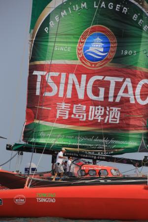 10月28日14时30分,带着青岛900万市民的祝福和期待,由“中国航海第一人”郭川率领的“中国·青岛”号成功抵达21世纪海上丝绸之路的第二个停靠城市广州。来自青岛、广州方面的嘉宾,广州航海界,红十字会代表,市民代表在码头处迎接“中国·青岛”号超级三体大帆船,争相一睹国际顶级帆船的英姿。在充满浓郁南粤风格的舞狮及青岛啤酒啦啦宝贝激情舞蹈的引领下,现场嘉宾为“中国·青岛”号国际船队船员带上象征幸福与成功的花环。
