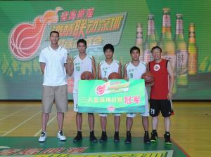 青岛啤酒股份有限公司营销总裁王瑞永(右一 )、易建联(左一)为青岛啤酒”激情联动深 圳“三人篮球赛总冠军颁奖